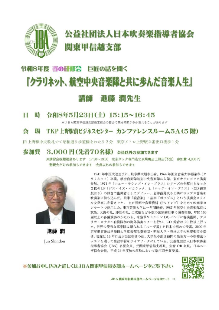 このたび、公益社団法人日本吹奏楽指導者協会 関東甲信越支部では、下記の通り研修会を実施いたします。