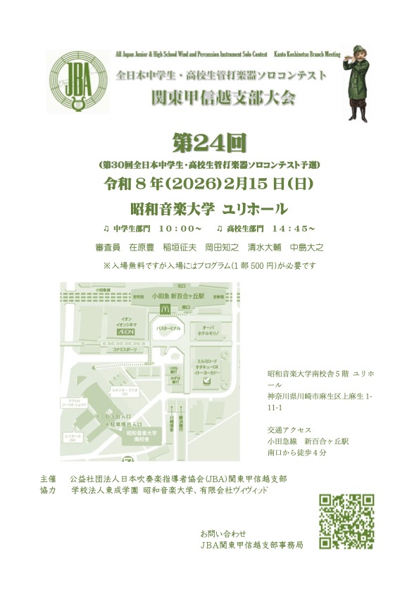このコンテストは、公益社団法人日本吹奏楽指導者協会(JBA)が行う事業の一つで、中学生及び高校生が吹奏楽で使われている、管打楽器等の演奏を通して、生涯音楽を心の友とする健全な情操豊かな人間性を形成すること並びに我が国の芸術文化の発展に寄与することを目的とするものです。JBA関東甲信越支部では、東京都、神奈川県、千葉県、埼玉県、茨城県、栃木県、山梨県、新潟県、群馬県、長野県の各部会、各地区でのソロコンテスト開催による推薦者にて全国大会の予選として運営を行っています。